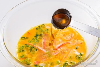 かに風味かまぼこは手でほぐす。ボウルに卵を割りほぐし、かに風味かまぼこ、青ねぎ、(A)を加えて混ぜる。
