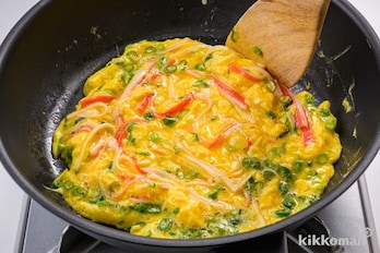 フライパンに油を中火で熱し、(1)を一気に入れ、菜箸でゆっくりと大きく円を描くように、4~5回混ぜる。周りが固まってきたら木べらなどで形を整え、半熟状になったら火を止める。