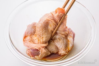 鶏肉は厚い部分を包丁でそぐように切り込みを入れて開き、厚さを均一にする。皮目にフォークで数か所穴をあけて、ボウルに入れる。しょうゆ、こしょうを加えて5分ほどおき、下味をつける。