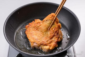フライパンにサラダ油を中火で熱し、鶏肉を皮目を下にして入れ、焼き色がついたら裏返す。両面に焼き色がついたら、ふたをして弱~中火で5分ほど焼く。