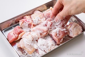 ねぎは3cm長さに切る。鶏肉は3cm角に切り、片栗粉を薄くまぶす。(A)は合わせておく。
