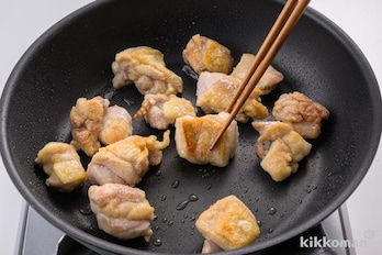 フライパンに油を中火で熱し、鶏肉を入れて5~6分炒め、いったん取り出す。
