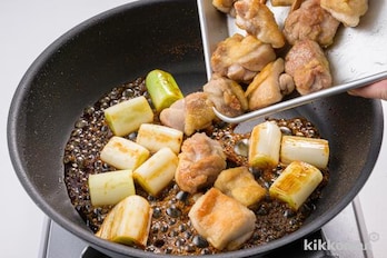 同じフライパンにねぎを入れ、表面に焼き色がついたら、(A)を回し入れて強火で加熱する。とろみがついたら鶏肉を戻し入れ、たれをからめる。