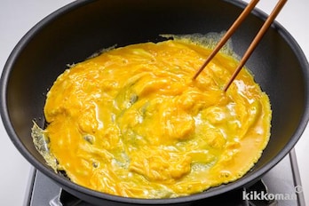 別のボウルに卵を割り入れ、みりんを加えて溶きほぐす。フライパンにごま油大さじ1/2を中火で熱し、卵液を入れる。菜箸で3〜4回大きく混ぜて、半熟状になったらいったん取り出す。