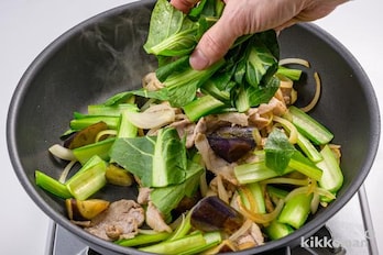 玉ねぎに透明感が出たら、小松菜を茎、葉の順に加えてさっと炒める。