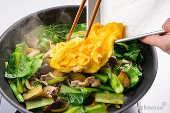 豚こま肉となすと小松菜のふんわり卵炒め【デイリー人気おかず】