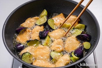 (1)の鶏肉の汁けをきって片栗粉をまぶす。フライパンに揚げ油を深さ1cm程度入れて中温に熱し、鶏肉、なすを入れ、途中上下を返しながら4分ほど揚げる。