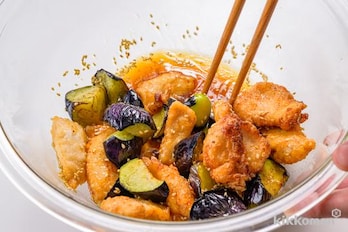 鶏肉となすに火が通ったら、油をきって甘酢だれのボウルに加えて、さっと混ぜる。