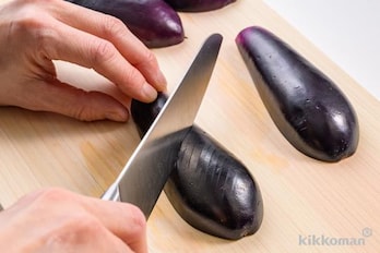 なすはへたを取って縦半分に切り、皮目に斜めに切り込みを入れてから半分に切る。