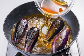 フライパンに油を入れて中火で熱し、なすを入れて皮目から炒め、全体に油がまわったら(A)を加えて煮立たせ、2~3分加熱したらそのまま冷めるまでおく。