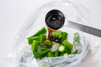 オクラは塩をふって板ずりし、水で洗い、へたを落として3cm幅に切る。