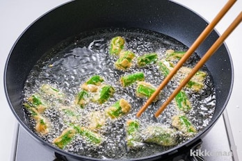 フライパンに深さ1cm程度まで油を入れて中火で熱し、(3)を入れてころもがカラッとするまで揚げる。