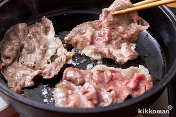 牛肉の1/4量程度をさっと焼き、(A)のしょうゆ、みりんを順に入れ、ざらめを加えて焼きからめる。好みで溶き卵をつけて食べる。