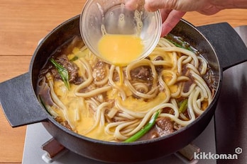【〆をつくる】うどんを入れてひと煮立ちさせ、溶き卵適量(分量外)を回し入れて、とじる。