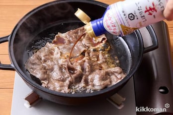 牛肉の1/4量程度をさっと焼き、(A)を加えて焼きからめる。好みで溶き卵をつけて食べる。