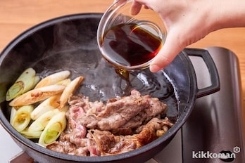 (3)の鍋にねぎ、残りの牛肉を入れて焼き、(B)を加えて中火で煮る。