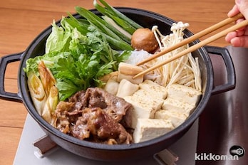 ねぎ、九条ねぎは斜め切り、白菜はザク切りにする。春菊は5cm長さに切る。えのきは根元を切って小房に分け、生しいたけは石づきを切る。しらたきは下ゆでして、食べやすい長さに切る。焼き豆腐は食べやすい大きさに切る。麩は水で袋の表示通りにもどし、軽く水けをしぼる。牛肉は大きい場合は食べやすい大きさに切る。