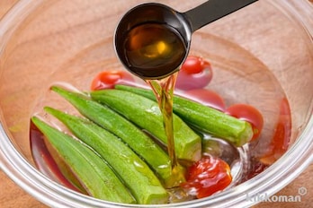 耐熱ボウルにオクラ、ミニトマト、(A)を入れる。丸く切ったオーブンシートをのせ、ラップをせずに電子レンジ(600W)で4~5分加熱する。