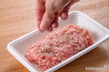 長芋はよく洗い、皮つきのまま5mm厚さの輪切りにする。ひき肉に塩、黒こしょう少々をふる。(A)は混ぜ合わせておく。