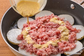 フライパンに油を入れ 、長芋をなるべく重ならないように入れ、その上にひき肉を平らに広げる。