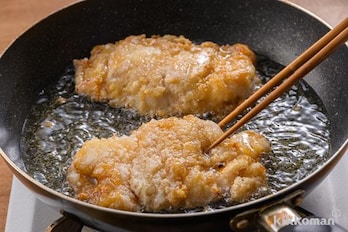(1)の鶏肉の汁けを軽くきって片栗粉をまぶす。フライパンに油を深さ1cmほど入れて中火で熱し、鶏肉を皮目から入れて5分ほど揚げる。
