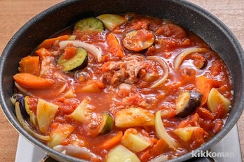 フライパンに油を中火で熱し、なす、玉ねぎを入れ、塩をふって、玉ねぎがしんなりするまで炒める。にんじん、じゃがいも、ツナ、(A)を加え、弱めの中火で3分ほど、ときどき混ぜなら煮る。