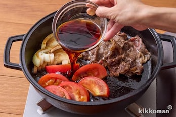 (3)の鍋に玉ねぎ、残りの牛肉、トマトを順に入れて焼き色をつけ、(B)を加えて中火で煮る。