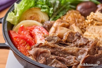 玉ねぎは繊維を断つように1cm幅に切る。トマトは8等分のくし形切りにする。九条ねぎは斜め切り、白菜はザク切りにする。春菊は5cm長さに切る。えのきは根元を切って小房に分け、生しいたけは石づきを切る。しらたきは下ゆでして、食べやすい長さに切る。焼き豆腐は食べやすい大きさに切る。麩は水で袋の表示通りにもどし、軽く水けをしぼる。牛肉は大きい場合は食べやすい大きさに切る。