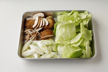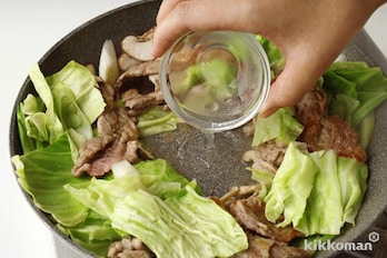 フライパンにごま油を中火で熱し、豚肉を広げすぎないようにクシュッとさせて入れる。ねぎ、しいたけ、キャベツの順にのせて、中火のまま2分焼く。