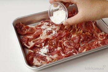 豚肉はキッチンペーパーをのせて水分をよく拭き取り、しょうゆ、こしょうをからめて5分おく。ざっと小麦粉をまぶす。【減塩ポイント】豚肉の水けをしっかり拭き取ると、下味のしょうゆが肉に入りやすく、少ない塩味でも味を感じられます。あえてむらが出るようにざっと小麦粉をまぶすことで、味にメリハリがつきます。