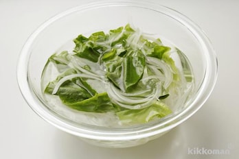 器に(1)の玉ねぎ、サラダ菜を盛り、(4)を汁ごとのせる。混ぜながら食べる。