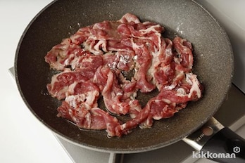 フライパンに油を中火で1分熱し、豚肉を広げすぎないようにクシュッとさせて入れる。【減塩ポイント】ていねいに広げず、あえて焼きむらを作ります。香ばしい部分とやわらかい部分、複数の食感が楽しめると食べ応えが出ます。