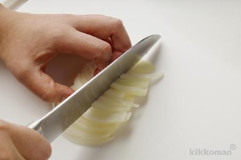 玉ねぎは薄切りにし、長さを半分に切る。【減塩ポイント】とろみがあると味を感じやすくなります。玉ねぎからもとろみとうまみをしっかり引き出したいので、角切りではなく薄切りに。一口ごとに玉ねぎを味わえるよう、半分に切ります。