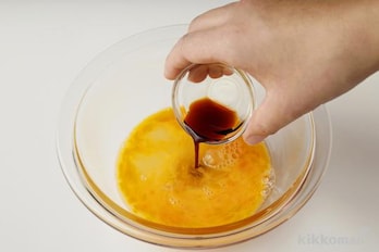 ボウルに卵を割り、菜箸で10回くらいを目安にとき、しょうゆ小さじ1を加えて混ぜる。【減塩ポイント】卵に下味としてしょうゆを加えておきます。淡い塩味でも重ねることで、料理全体として減塩しながら満足感ある仕上がりになります。