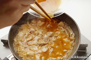 直径20cmのフライパンに(A)を入れて中火で煮立てる。玉ねぎ、鶏肉を加えてそのまま2分煮て、上下を返す。