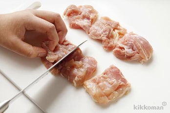 鶏肉は余分な脂を除いて、6等分に切る。【減塩ポイント】余分な脂(雑味)を取り除くことで食材のおいしさが際立ち、淡い味つけでも十分な仕上がりに。このくらいの大きさで切ると肉汁が抱え込まれ、ジューシーで食べ応えが出ます。