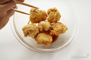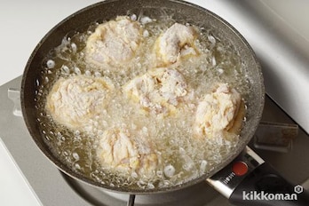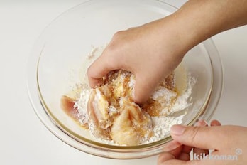 小麦粉大さじ4をふり入れ、よくもみ混ぜて5分おく。さらに小麦粉1/2カップをふり入れて鶏肉1かけずつにまぶし、軽くにぎる。