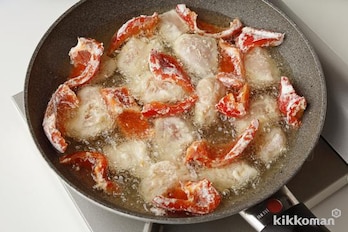 直径26cmのフライパンに揚げ油を入れ、4~5分熱して170℃に温め、鶏肉を入れ、周りにパプリカを入れる。少し火を強め、ころもがカリッとして薄く色づくまで、4~5分揚げる。