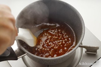 小鍋に(A)を入れ、よく混ぜながら強めの中火にかける。とろみが出てきたら、さらによく混ぜて20~30秒ほど煮立てる。【減塩ポイント】強めの中火で煮立てることで、たれに熟成感が出ます。塩分に頼らずに味わい深さが増します。