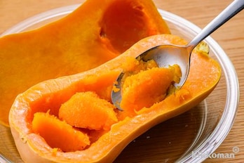 バターナッツかぼちゃは縦半分に切って、種とわたを取り除く。それぞれをラップで包み、耐熱皿にのせて電子レンジ(600W)で6~7分加熱する。