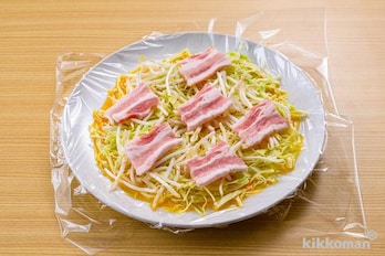キャベツ、もやし、豚肉の順に広げてのせ、こしょうをふる。上からふんわりとラップをかけ、電子レンジ(600W)で4分30秒加熱する。