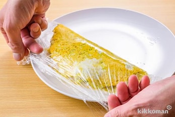 耐熱皿にラップを敷き、(2)の卵液を流し入れる。