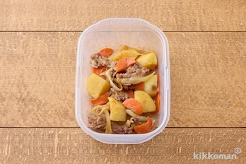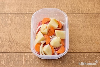 耐熱容器に豚肉、玉ねぎ、にんじん、じゃがいもの順に入れ、(A)を上からかけ、ふんわりとラップをして電子レンジ(600W)で7分加熱する。