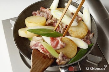 じゃがいもはよく洗って皮をむき、1.5cm厚さの輪切りにする。5分ほど水にさらし、水けを拭く。ねぎは1cm幅の斜め切りにする。【減塩ポイント】じゃがいもを輪切りにすることで、味がからみやすくなり、断面からとろみが出ます。とろみによって薄味でも味を感じやすくなります。ねぎも斜めに切ることでとろみが出やすくなります。少ない煮汁での調理は、加熱時間が短くなるので玉ねぎよりも火の通りが早いねぎがおすすめです。