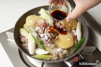 肉の色が変わってきたら、水1/3カップを加えて煮立て、(B)を加えて強火にし、再び煮立たせる。【減塩ポイント】加える水は少なめでOKです。調味料を加えた後に、一度強火にすることで少ない煮汁が食材の上まで届き、味が全体にいきわたります。