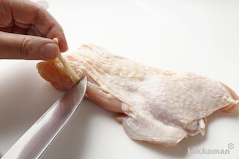 ねぎは5~6cm長さ、1cm幅の斜め切りにする。しいたけは3mm幅の薄切りにし、石づきは細かく裂く。貝割れ菜は根元を切る。鶏肉は余分な脂肪を取り除き、2cm角に切る。(A)は合わせておく。【減塩ポイント】ねぎは斜めに切ることでとろみが出やすく、薄味でも味を感じやすくなります。鶏肉は余分な脂(雑味)を取り除くことで食材のおいしさが際立ち、薄味でも満足できる仕上がりに。
