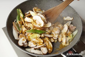 小麦粉、カレー粉をふり入れて1分炒める。【減塩ポイント】具材に直接カレー粉をからめることで、食べた時にカレー味を強く感じます。また、カレー粉は火を入れることで香り、辛みが際立ち、熟成感が出ます。小麦粉のとろみで味を感じやすくなり、減塩でももの足りなさを感じません。