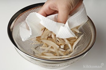 ごぼうはスプーンでざっと皮をこそげ、手で回しながら削るように薄くそぎ切りする(ささがき)。水にさらして、水けをよく拭き取る。【減塩ポイント】減塩調味のコツは水っぽくしないこと。ごぼうの水けはしっかり拭き取ります。