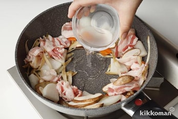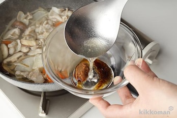しいたけ、豚肉の順にのせ、中央をあける。(A)をよく混ぜてから中央に加え、肉の色が変わり、水分がなくなるまで炒める。【減塩ポイント】豚肉を具材の上にのせるのがポイント。直接フライパンに触れさせず、塩水で下味を染み込ませながら炒めることで、豚肉が縮まず、アクも出にくくなり、脂が甘く仕上がります。具材には塩味、煮汁にはみそ・しょうゆ味をつけることで、複数の塩味によるメリハリが生まれ減塩を感じさせません。