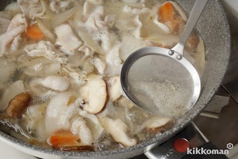 水1と3/4カップを注ぎ、煮立ったらアクを取り除き、弱火にして10分煮る。